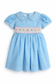This timeless dress features pastel hand-smocking, puff sleeves, and a Peter Pan collar — all crafted in breathable piqué cotton. A sweet heirloom piece for birthdays, portraits, and special days.