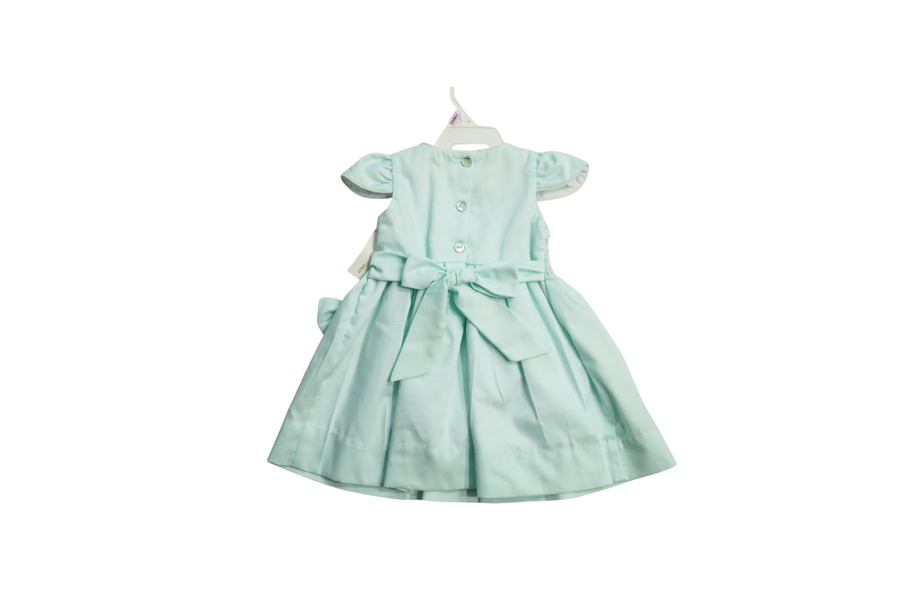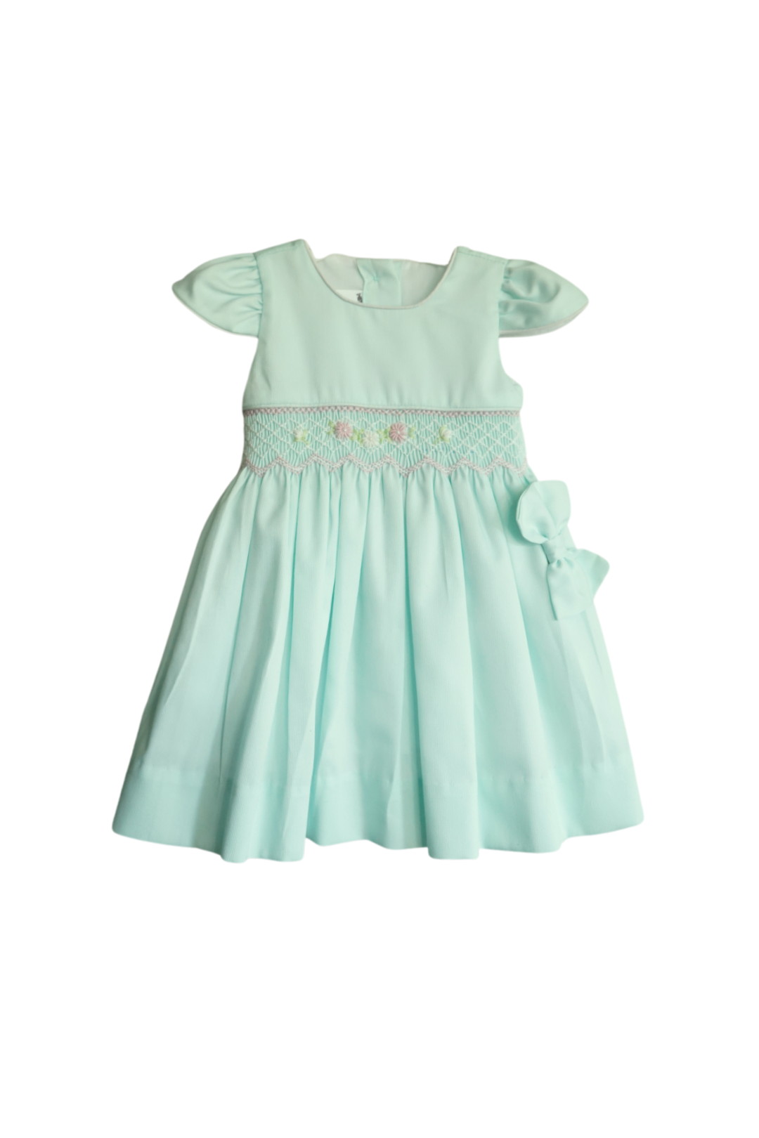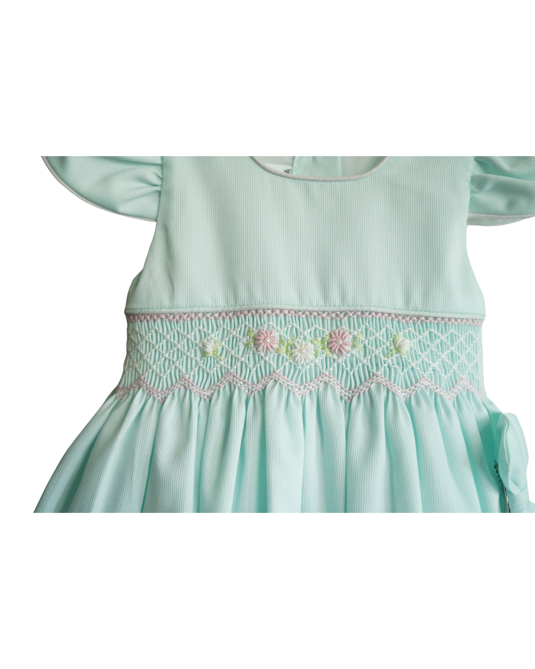 Sweet and timeless, this mint green dress by Mini Muuu! features pastel hand-smocking, flutter sleeves, and a side bow for classic charm. Made with breathable piqué cotton for comfort and style.