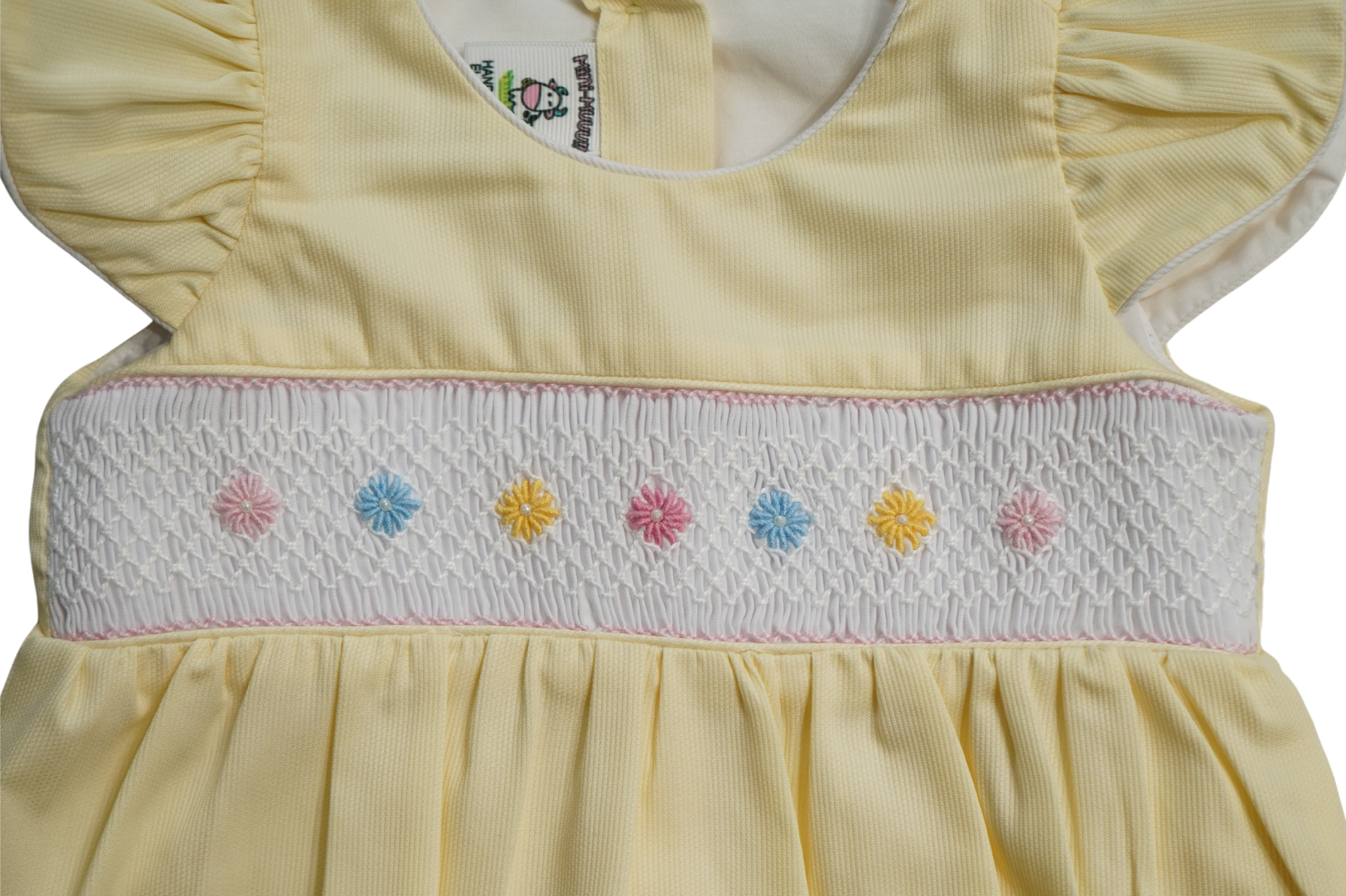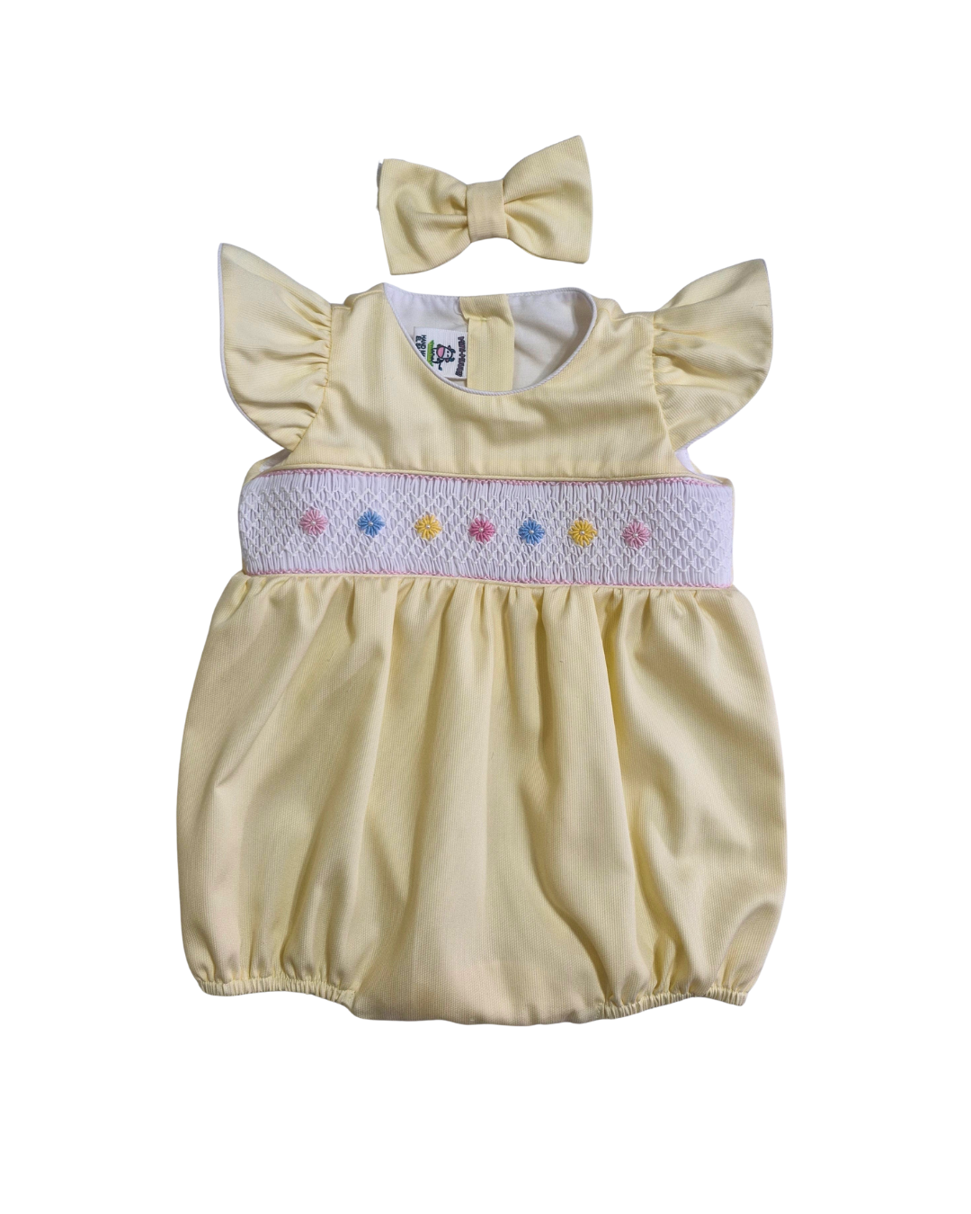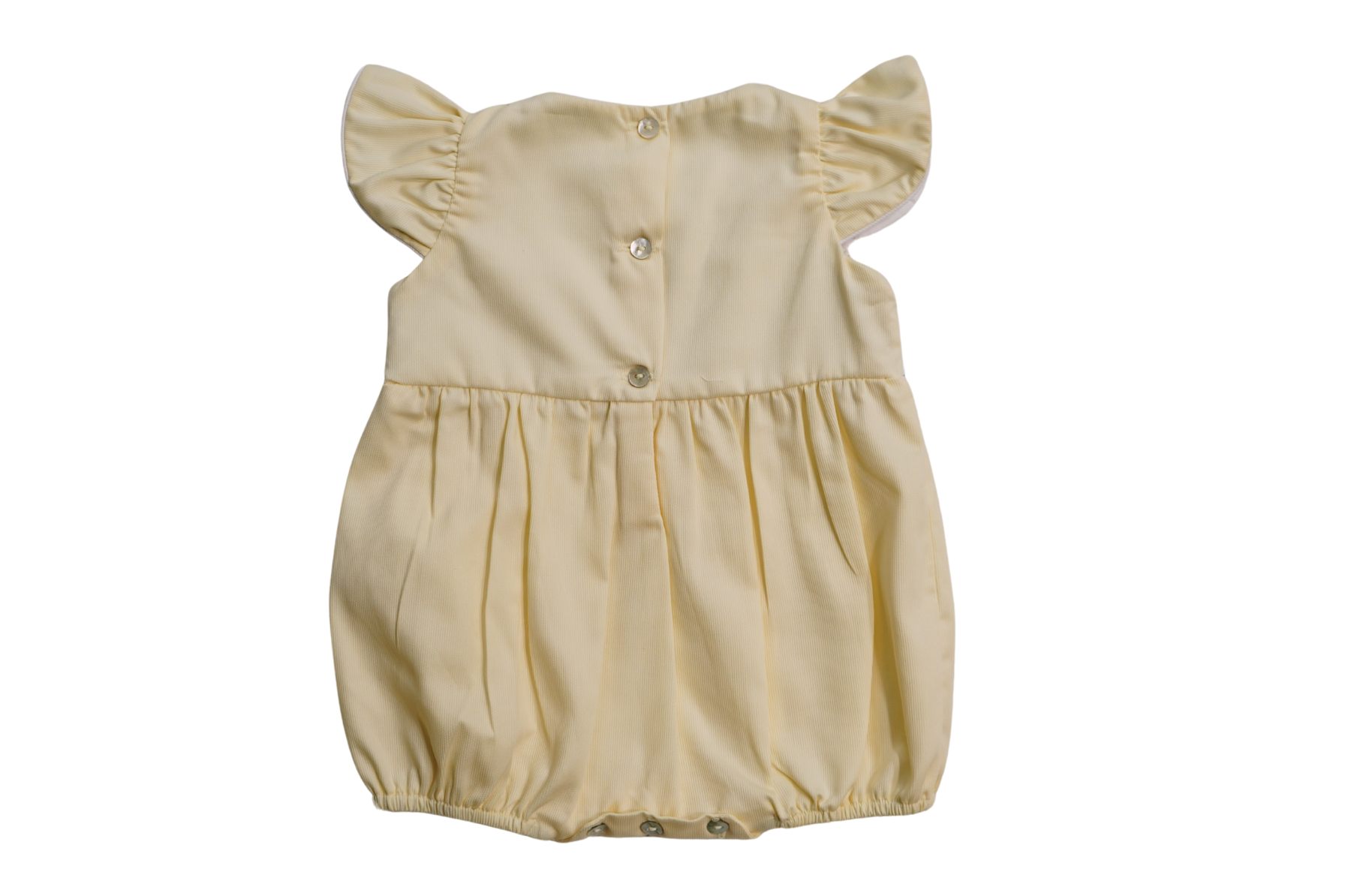 This sweet romper by Mini Muuu blends vintage charm with everyday comfort. Made from breathable piqué cotton, it features pastel hand-smocking, flutter sleeves, and elastic leg openings for a cozy fit.